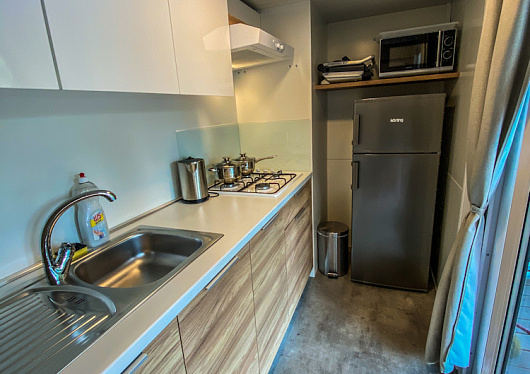 mikrovlnkou, chladničkou, koupelna se sprchovým koutem a WC. Součástí domu